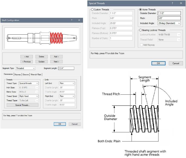 For threaded segments, click Special Threads to specify custom, acme, or bearing locknut thread parameters. For custom threads, enter the outside diameter of threads, the thread pitch, the included angle of the threads, the flatness at both the top (at the outside diameter) and bottom (at the root diameter) of the threads, and the number of starts. For Acme threads, enter the outside diameter of threads, the thread pitch, and select the included angle of the threads. For bearing locknut threads, select the bearing locknut number, the thread relief position (if any), and add a keyway, if desired. |