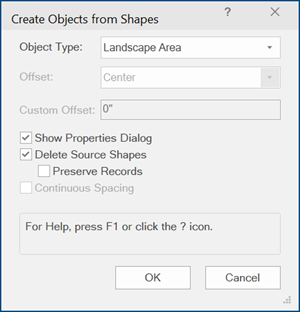 Select the polyline if it's not already selected. Select the Create Objects from Shapes command. In the Create Objects from Shapes dialog box, choose Landscape Area as the Object Type. Select the options for Show properties dialog and Delete source shapes.