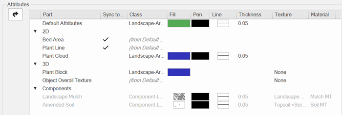 Edit the landscape area style again from the Resource Manager. From the Attributes pane, deselect the check mark in the Sync column for both the Plant Cloud and the Plant Block. Then select a purple Fill color (Solid Fill Style) for each by clicking on the color box.