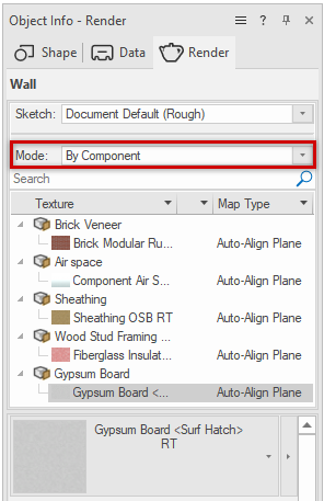 Walls and some other objects with components, such as slabs and roofs, can have textures applied using the Render tab of the Object Info palette.