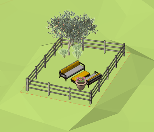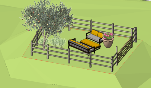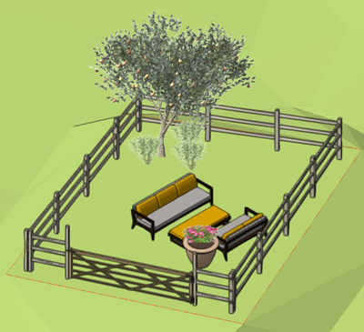 Let's add plants and a seating area to the garden, and then a fence.