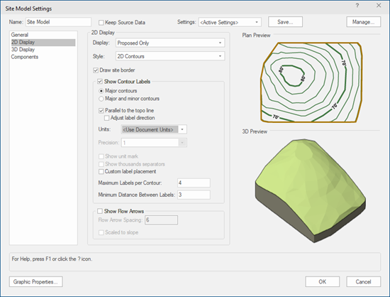 On the 2D Display and 3D Display panes of the site model settings, select the Proposed Only Display. Select a 2D Display Style of 2D Contours and a 3D Display Style of 3D Mesh.
