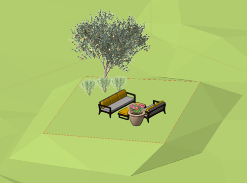Open the Resource Manager (Ctrl+R (Windows) or Cmd+R (Mac)) if it's not already open. In the Resource Manager, search for the term "layout." Select the "Site layout - Patio couches with planter" layout symbol, and place it in the garden area. Because we're in a 3D view, the symbol is placed on the surface of the site model.