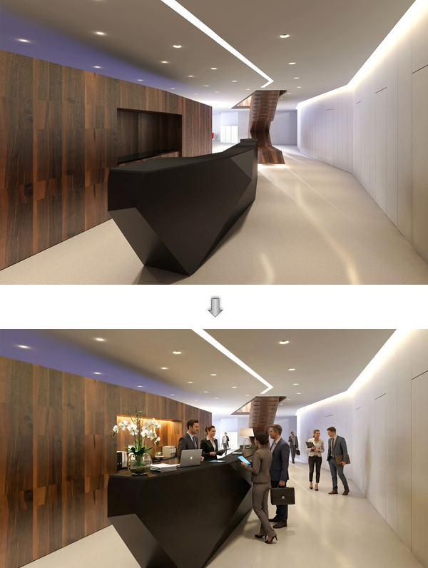 Provide a reference image, of a cityscape in this case, and instructions for how to use the image as the exterior view out the window. You should include specific instructions for both the Vectorworks drawing (to preserve interior elements exactly as they are) and for the exterior view (as to scale, perspective, lighting, and so on) to get the desired results.