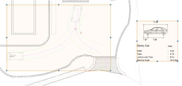 Once the swept path analysis is complete, the color-coded analysis envelopes, path polyline, and data can be inserted back into the Vectorworks drawing.
