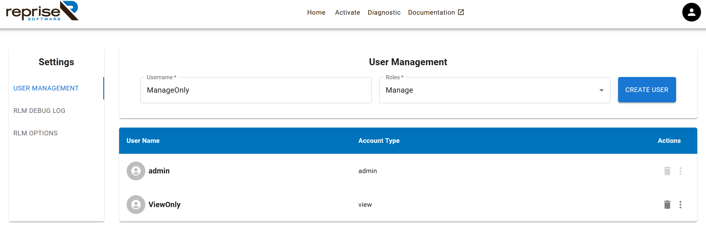 In addition to User Management, you can access the RLM Debug Log and the RLM Options from the Settings screen. See The Debug log.