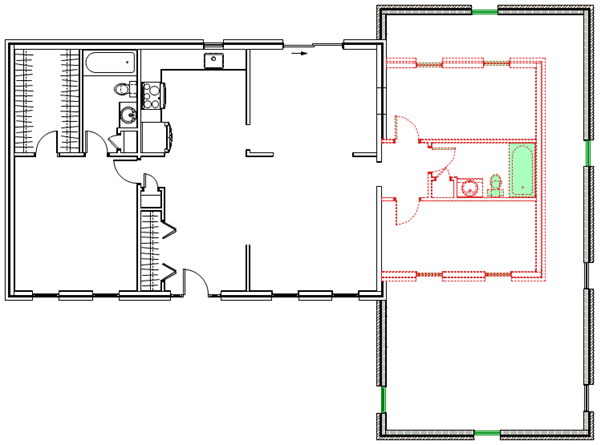 Use data visualizations to control both the visibility and the attributes of drawing objects based on their status in the active phase of a design layer or in the selected phase for a sheet layer viewport. With no data visualizations applied, you can't distinguish which changes are made in which phase. If the same data visualization is applied as you change the active phase, the appearance of the objects in the drawing changes as their status in the active phase changes. Some objects may be shown or hidden, and the attributes of other objects change depending on their status. Vectorworks provides several data visualizations with commonly used settings for phasing as part of the Architect and Interior templates, and you can use phasing-related criteria to create custom data visualizations as needed.