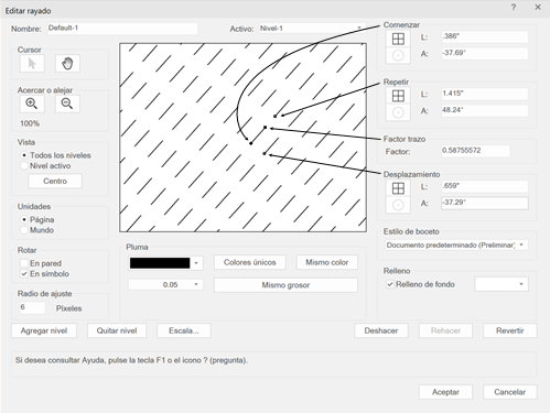 Tanto rayados asociativos como no asociativos deben ser definidos. Una definición de rayados es una repetición de los elementos en una serie de líneas en todas direcciones desde el punto de inicio. Especifique dónde comienza la línea de rayado (el Punto de inicio), dónde se detiene (el Factor de trazo), dónde comienza a repetirse (el Repetir) y la distancia que separa la línea de una línea vecina (el Desplazamiento); el patrón es repetido en todas direcciones.