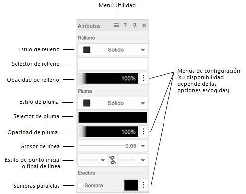 Puede especificar todos los tipos de atributo (relleno, pluma, opacidad, grosor de línea, punto inicial y final de línea y sombras paralelas) directamente en la paleta Atributos. También puede usar el Administrador de recursos para aplicar tipos de líneas, rellenos de achurado, mosaico, gradiente e imagen. Use los ajustes de configuración en la paleta Atributos para asignar o ajustar el recurso para adaptarlo a un objeto específico, de ser necesario. Consulte la información adicional en los temas Atributos Atributos de relleno, Atributos de pluma y Atributos de sombras paralelas.