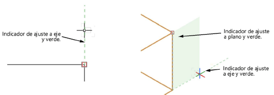 Ejes ligeramente coloreados e indicadores de plano proveen sugerencias sutiles para ayudar a determinar si el cursor está alineado a un eje (2D) o a un eje y un plano (3D). El color del indicador concuerda con el color del eje (rojo para X, verde para Y, y azul para Z) para ayudar a determinar cuando el cursor está alineado a un eje o a un plano.