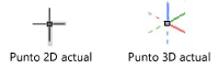 El indicador del punto de acoplamiento actual es negro en vista bidimensional. En 3D, el indicador se muestra con colores rojo, verde y azul, que corresponden a los ejes rojo (X), verde (Y) y azul (Z). La orientación del indicador 3D es relativa al plano de trabajo actual; las líneas punteadas indican los ejes negativos.