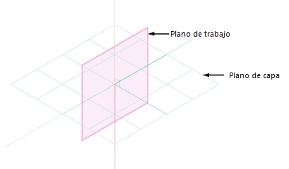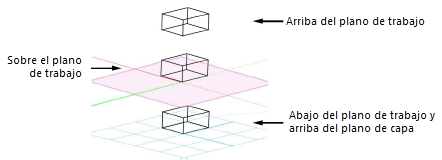 Cada objeto creado en el dibujo queda colocado respecto al plano de la capa activa, ya sea directamente en ese plano o bien puesto arriba o debajo de él. Si cambia la ubicación del plano de trabajo, el plano de capa permanece visible, lo cual sirve de marco de referencia mientras ajusta el plano de trabajo.