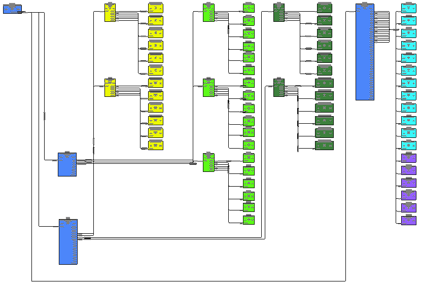 El diagrama esquemático muestra un flujo de señal de izquierda a derecha, con dispositivos en el mismo nivel jerárquico presentados en columnas. Dispositivos están dispuestos para minimizar el número de circuitos que se cruzan sobre sí mismos.