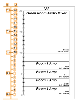 La regla en unidades de bastidor mide la altura de bastidores de equipos colocando una regla 2D en el dibujo o anotación de viewport como marcas de unidad de dibujo y de unidad de bastidor. Las medidas de la regla son presentadas en las unidades especificadas en las configuraciones de documento (consulte Configuraciones de unidades: Panel Cotas).