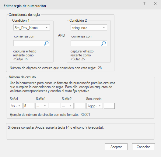 Los criterios de coincidencia de regla consisten en dos condiciones. Ambas condiciones deben ser cumplidas para que la regla sea considerada una coincidencia, y para que el formato de número de cable sea aplicado a los circuitos.