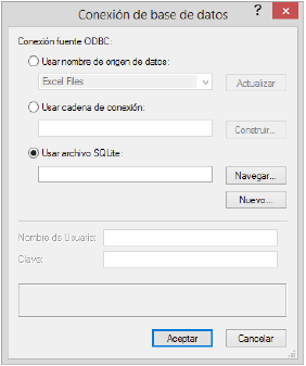 Seleccione el archivo SQLite o la base de datos nombrada y agregada al gerente/administrador de ODBC anteriormente; ingrese un Nombre de usuario y una Contraseña, si es necesario.