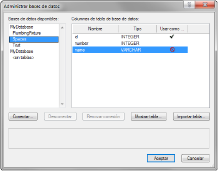 La base de datos seleccionada es agregada a la lista de bases de datos disponibles en el cuadro de diálogo Administrar bases de datos. Las tablas asociadas con la base de datos son enumeradas a la izquierda, con las columnas de la tabla de base de datos enumeradas a la derecha.