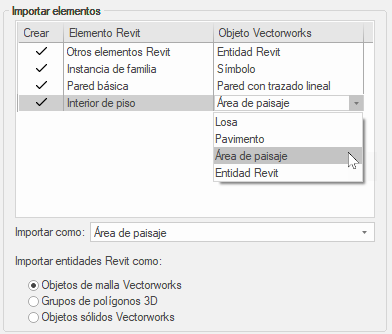En el caso de elementos de Revit que deban importarse como distintos tipos de objetos de Vectorworks en función del contexto, puede seleccionar el tipo de objeto necesario; por ejemplo, un objeto de piso de Revit puede importarse como objeto de losa, objeto paisajístico u objeto de paisaje de Vectorworks.