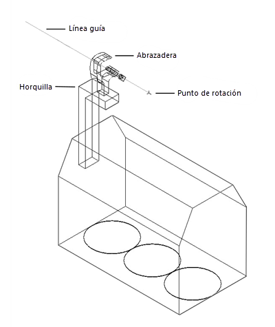 Si una pieza es usada para inclinar el dispositivo multicelda (moviéndolo a lo largo del eje X), esa pieza debe ser definida como Horquilla. Esto incluye el soporte de horquilla típico para dispositivos suspendidos, pero también los pies en dispositivos montados en el piso. Si bien los pies proporcionan un base para el dispositivo, deben ser definidos como piezas de Horquilla porque el dispositivo los usa para inclinar.