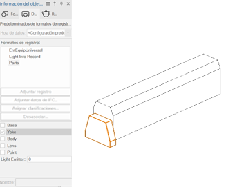 El registro Piezas es requerido para el giro correcto de cada símbolo de celda. Complete los siguientes pasos para adjuntar el registro Piezas al lente, carcasa y punto de locus 3D de la celda—y a la base, horquilla y accesorios si están presentes en la celda. (Más adelante en el flujo de trabajo, el registro Piezas será adjuntado al símbolo contenedor de multicelda para definir el punto de giro del dispositivo y especificar cuál celda controla cada emisor de luz.)