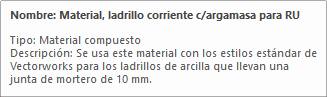 Aparecen el nombre, la descripción y el tipo de material simple o compuesto cuando pasa el cursor sobre uno de los materiales en el Administrador de recursos. En la descripción normalmente se incluyen datos como el uso común y corriente del material, su composición, tamaño (si es pertinente) y otros detalles.