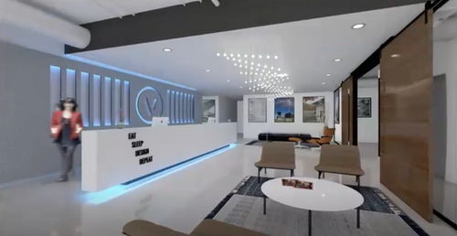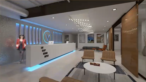 El tipo de renderizado Realistic (arriba) y el tipo de renderizado Realistic RS (abajo) proporcionan renderizados de alta calidad de esta área de recepción corporativa, pero interpretan luz, reflejos y texturas de manera diferente