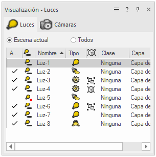 En una capa de diseño, la paleta enumera todas las luces en el archivo o sólo aquellas que afectan la vista actual.