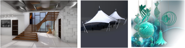 Use Superficies NURBS, y herramientas y comandos asociados como las herramientas Membrana, Extraer y Proyectar, y el conjunto de comandos 3D Power Pack, para crear formas libres irracionales como telones y otros objetos fluidos, y luego use vértices de peso para “jalar” la superficie y darle forma. Superficies pueden ser convertidas en formas sólidas usando características como la herramienta Funda sólida y el comando Unir y acortar superficies.