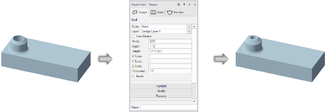 Quitar [característica] inmediatamente elimina la característica seleccionada desde el historial de objeto y reconstruye el objeto sólido.