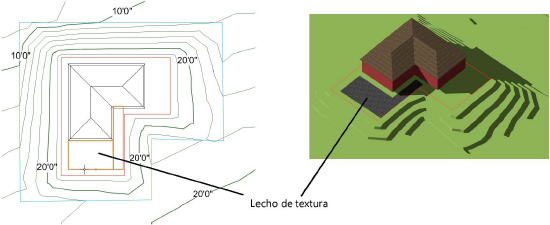 El modificador de lecho de textura puede convertir un polígono 2D en un área del dibujo que puede ser texturizado. Por ejemplo, aplicar textura a un jardín con césped, una terraza con ladrillos, o a un arenero con arena para dar una apariencia de render con realismo fotográfico. Para dibujar un lecho de textura, usar la herramienta Modificadores de terreno, o dibujar una polilínea y luego seleccionar el comando Crear objetos desde formas (consultar Crear objetos desde formas).