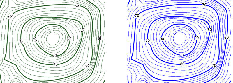 A la izquierda, Paralela a la línea topográfica está seleccionado. A la derecha, no está seleccionado. |