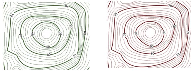 Crea sólidos horizontales con un grosor igual al intervalo de contorno; los bordes superiores recorren sobre las líneas de contorno o el límite de sitio. Esto crea un efecto de “torta de hojas” o “modelo aglomerado”. |