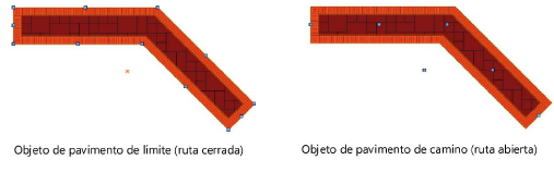 Después de la creación, un objeto de pavimento de límite puede ser convertido en un objeto de pavimento de camino y, de manera similar, una configuración de camino puede ser convertida en una configuración de límite. La conversión conserva la apariencia, pero la ruta del objeto cambia. Puede convertir la configuración una vez de manera confiable; conversiones repetidas pueden corromper el objeto.