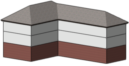 Un modelo volumétrico con alturas de piso individuales tiene un primer piso más alto para espacio comercial, y dos pisos superiores más bajos para uso residencial. Grosor de losa configurado igual a alturas de piso le permite a cada piso tener una textura aplicada a la pared completa.