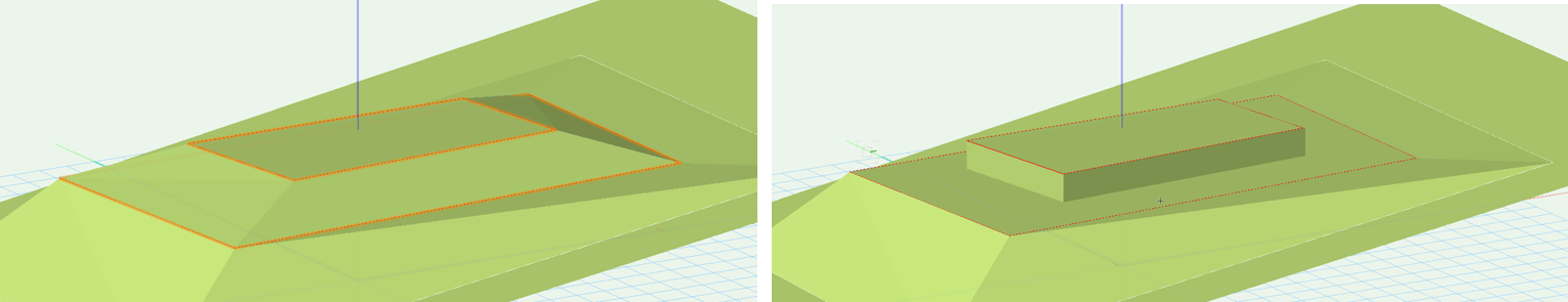 Actualiza los cálculos de área y volumen presentados en la paleta Información del objeto para el área del modelo de sitio ubicado debajo del modificador de pavimento (límites de pendiente deben existir alrededor del bloque) |