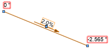 Presenta la longitud proyectada de longitud de pendiente/de superficie y la flecha de pendiente; la flecha de pendiente siempre indica la dirección de pendiente descendente. Ingrese un prefijo para el valor, si desea. La longitud proyectada es la distancia entre los puntos según lo medido a lo largo de una proyección horizontal; la longitud de superficie es la distancia entre los puntos según lo medido a lo largo de la superficie, facilitando un cálculo más preciso para estimaciones de compra. Si Mostrar valor de longitud proyectada y Mostrar valor de longitud de superficie son seleccionados, ambos valores son presentados a lo largo del objeto de pendiente con una barra diagonal (/) entre ellos (prefijo + longitud proyectada/prefijo + longitud de superficie). |