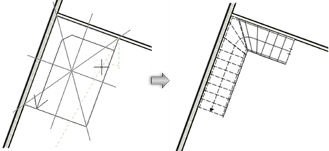 Se usa el modo Rotación de tres puntos para trazar escaleras basadas en rectángulos rotados. Puede acoplarlas a los elementos constructivos contiguos para delinear precisamente el límite exterior de la escalera. Si desea configurar ciertos parámetros de geometría de escalera, especifíquelos en el cuadro de diálogo Preferencias escalera primero. Los ajustes de configuración de las dimensiones generales de la escalera (Ancho de escalera, Lateral, Longitud, etc.) se ajustan para coincidir con el límite exterior trazado de la escalera. Los demás ajustes de configuración de la geometría de escalera quedan sin modificar en la medida de lo posible en Configuración de escalera si usa la herramienta Escalera para calcular la escalera.