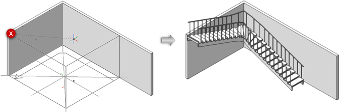 Al trazar los límites externos de una escalera en una vista tridimensional, use el modo Altura de la escalera para definir la altura total de la escalera con un solo clic al tiempo de poner la escalera. De esta manera, es más fácil alinear la escalera con elementos constructivos adyacentes que definir la altura total en el cuadro de diálogo Configuración de escalera.