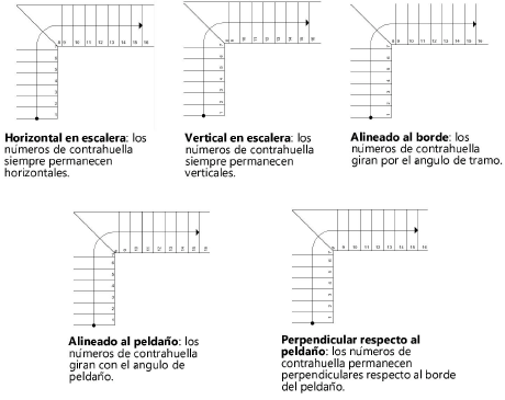 Para escaleras rectas, indique si números de contrahuella se presentan en el centro, a la izquierda o a la derecha del tramo. Para otras escaleras, indique si números de contrahuella se presentan centrados, o en costado interno o externo del tramo de la escalera. El valor Desplazamiento define la distancia entre los números de contrahuella y el límite de la escalera. |
