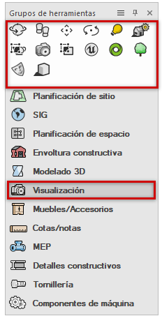 Si una paleta de herramientas tiene varios conjuntos de herramientas (como la paleta Grupos de herramientas), aparecen en la paleta los botones de selección de cada conjunto de herramientas. Para presentar las herramientas de un conjunto de herramientas, haga clic en botón correspondiente. El botón está resaltado para indicar el conjunto de herramientas activado.