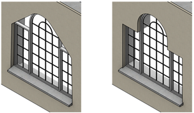 Si el símbolo no tienen componentes de orificio de (mostrado a la izquierda) la pared crea una abertura que abarca la forma 3D completamente. Con un componente de orificio de (mostrado a la derecha) el símbolo crea un orificio de la forma correcta.