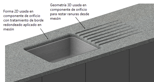 Para un mesón con un lavaplatos y tabla de drenaje personalizada, un componente de orificio usando una combinación de geometría 3D y 2D puede ser usado