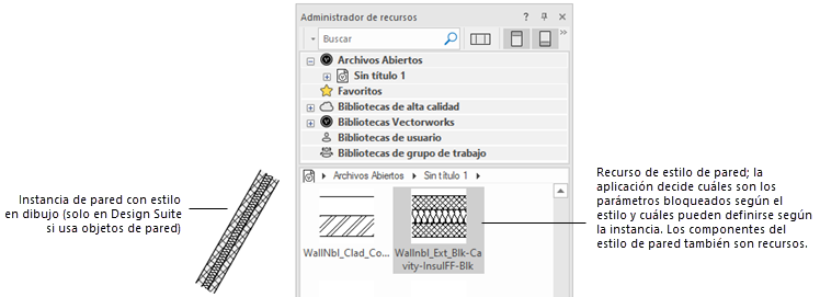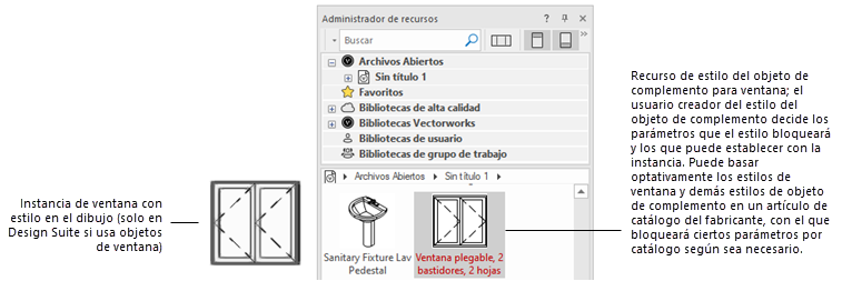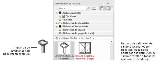 Definiciones de símbolo y estilos de objeto definen todo, o algunas partes, de un objeto, por lo que la geometría/parámetros del objeto son iguales para toda instancia que usa esa definición/estilo. Vectorworks incluye miles de definiciones de símbolo y estilos de objeto comúnmente usados, y también puede crear definiciones/estilos para cumplir con sus necesidades específicas. Definiciones y estilos son recursos que se acceden a través del Administrador de recursos para su uso al colocar instancias de objeto en el dibujo; también pueden ser compartidos con otros usuarios y en otros archivos.