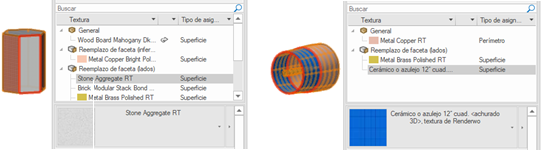 Haga clic en un elemento de lista para resaltar los bordes de esa faceta en el objeto, y edite la selección o asignación de textura.