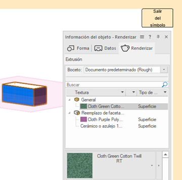La paleta Información del objeto no puede ser usada para aplicar texturas a facetas que aún no tienen una textura individual aplicada; primero use la herramienta Textura para aplicar texturas a facetas individuales; consulte Aplicar texturas a objetos y facetas usando la herramienta Textura. Una vez texturadas, estas facetas se presentan en el explorador Textura donde pueden ser administradas.