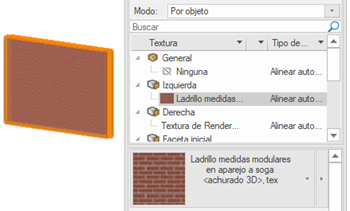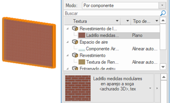 Para algunos objetos con componentes texturables como paredes, cubiertas, losas y pavimentos, el explorador Textura de la paleta Información del objeto presenta los componentes del objeto o sus partes, dependiendo del Modo seleccionado; configure estos objetos Por componente para la mejor precisión de dibujo. Consulte Administrar texturas de objeto desde la paleta Información del objeto para información sobre las operaciones que pueden ser completadas en el explorador Textura.