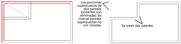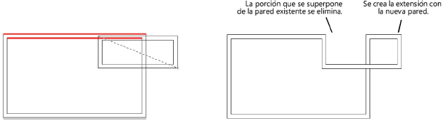 Si la nueva pared extiende parcialmente y parcialmente traslapa una pared existente, la parte traslapada es eliminada y la parte extendida es creada con la nueva pared.