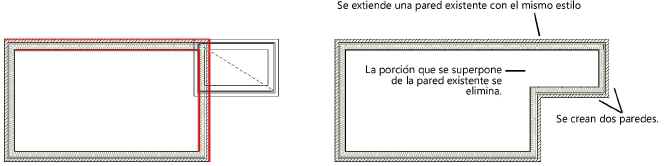 Si la nueva pared extiende la pared existente y tiene el mismo estilo, la pared existente es extendida y la nueva pared no es creada. Si la nueva pared tiene un estilo diferente, es creada.