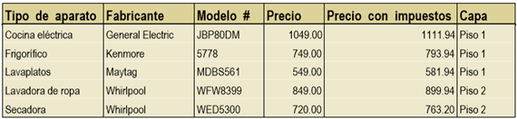 En este ejemplo, la fila 1 de la hoja de cálculo tiene etiquetas para las columnas de base de datos. La fila 2 de encabezado de base de datos está configurada para enumerar cada objeto en el dibujo que tiene un “registro de electrodoméstico” adjuntado. Las subfilas 2.1 a 2.5 representan los cinco objetos en el dibujo que cumplen con estos criterios.