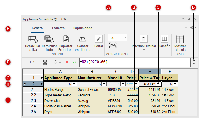 A: Campo de fórmula B: Aumente el ancho de columna para ver este número C: Abre un cuadro emergente para editar los contenidos de columna D: Expande y colapsa el campo fórmula E: Barra de herramientas, con pestañas F: Barra Fórmula G: Fila de hoja de cálculo H: Fila de encabezado de base de datos I: Subfilas de base de datos |